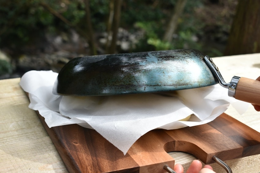 フタ付きのものであれば、ダッチオーブンと同じ様にフタの上に炭を置けるので、パンを焼きやすいです。フタがない場合は、同サイズのスキレットを上から被せてフタ代わりにしてもOK。