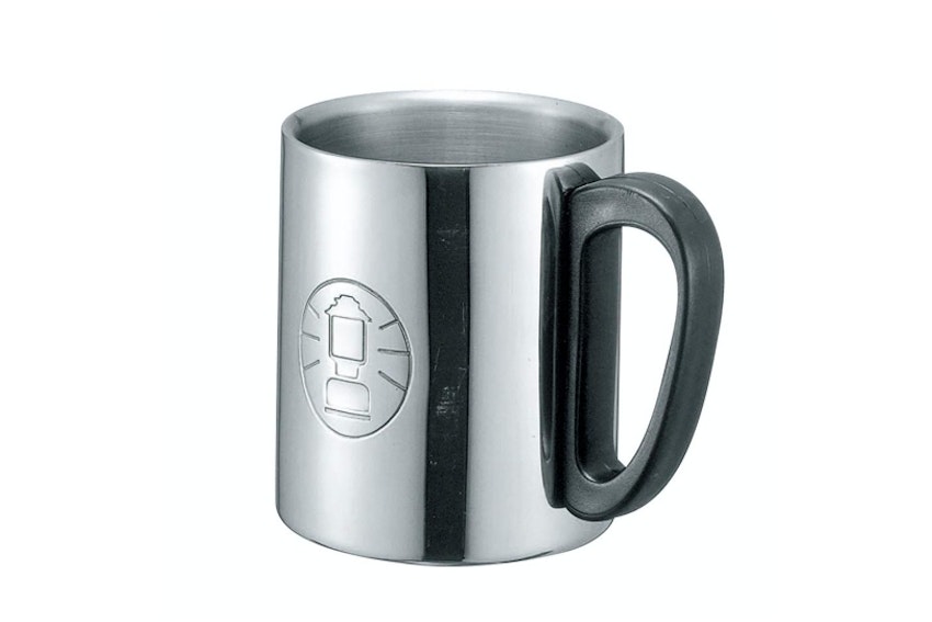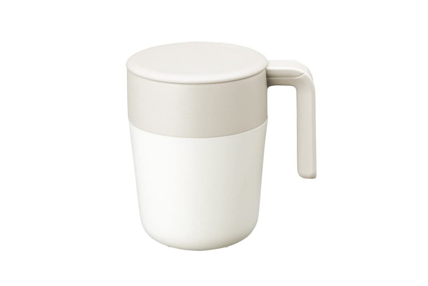 ステンレスの2層構造で保温、保冷力のあるマグカップ。比較的リーズナブルに手に入るのもうれしい。取っ手はポリプロピレンなので熱くならず握りやすい仕様です。