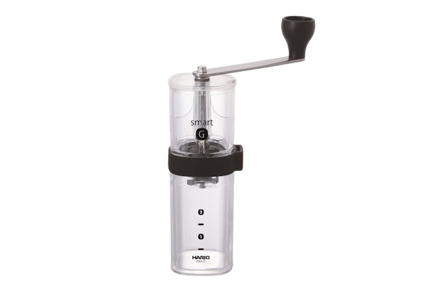 透明なミルで中身が確認しやすく、豆の様子が一目でわかります。クリアな見た目もおしゃれな雰囲気に。臼の部分は分解して手入れ可能。バンド部分にハンドルを差し込めるので、携行性にも優れたミルです。