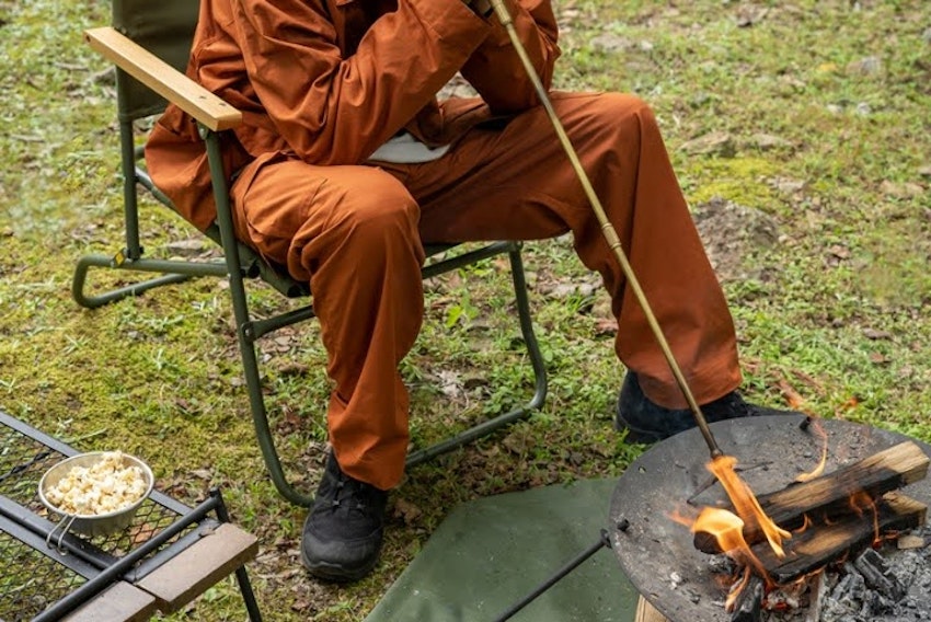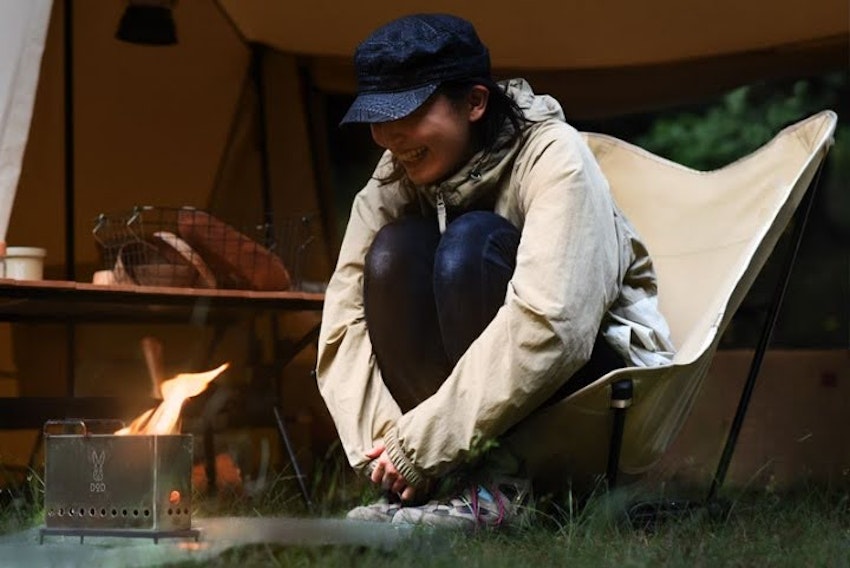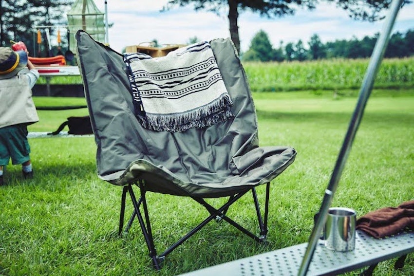 座面の前方にやや高さがあり、背もたれに体を預けて焚き火を眺めることが可能。コットン100%で作られているので火の粉で穴が開きにくく、のんびりと焚き火が楽しめます。収納袋が付属しているので、持ち運びやすいのも魅力的です。