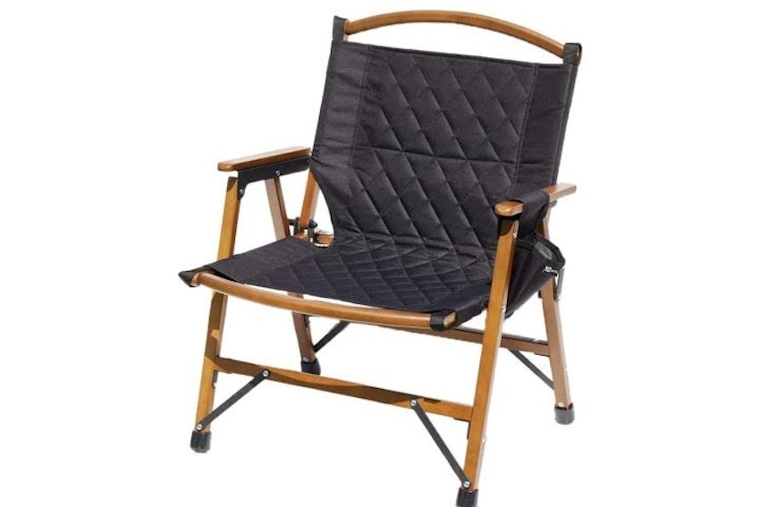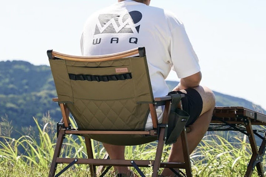 背もたれにキルティング加工を施し、座り心地を高めるクッション性を実現。背面にはシェラカップ等が吊るせるハンギングチェーンやドリンクを入れておけるポケットなど、機能性に優れたおしゃれチェアです。