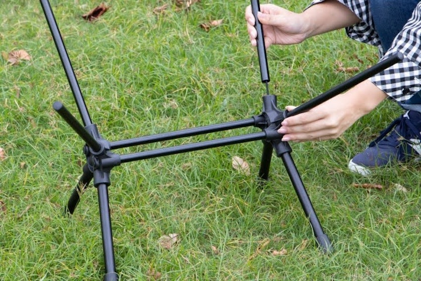 脚部の中心にフレームポイントを設けており、簡単にフレームを組み立てることが可能に。4点からなるフレームでハンモックのような座り心地が感じられるうえに、難燃記事を使用しているので焚き火の火の粉でも穴が開きにくいのも嬉しいポイントです。