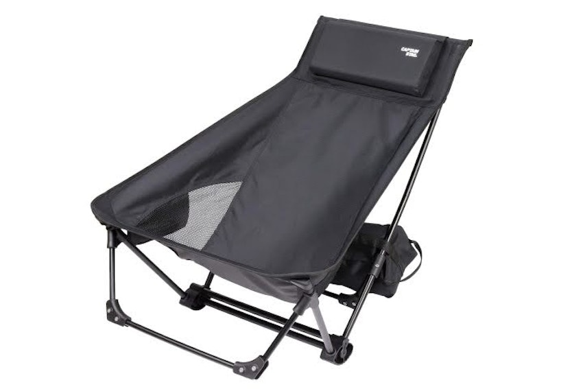 座ったまま角度調整が可能なだけでなく、ヘッドレストを搭載しているのでよりリラックスした体勢で過ごすことができます。収納ケースを背面に取り付ければ小物入れになり、サイドにはドリンクホルダーがあるなど収納性も抜群のローチェアです。