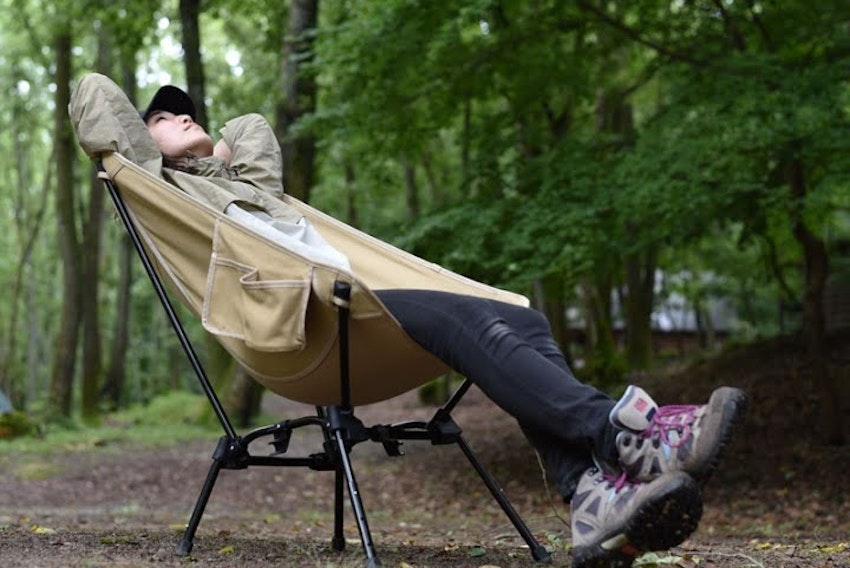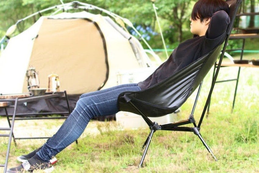 背中から頭まで預けて座ることができるので、日中にコーヒーを飲みながら過ごすチルタイムや、夜には焚き火を眺めながら過ごすのに最適です。