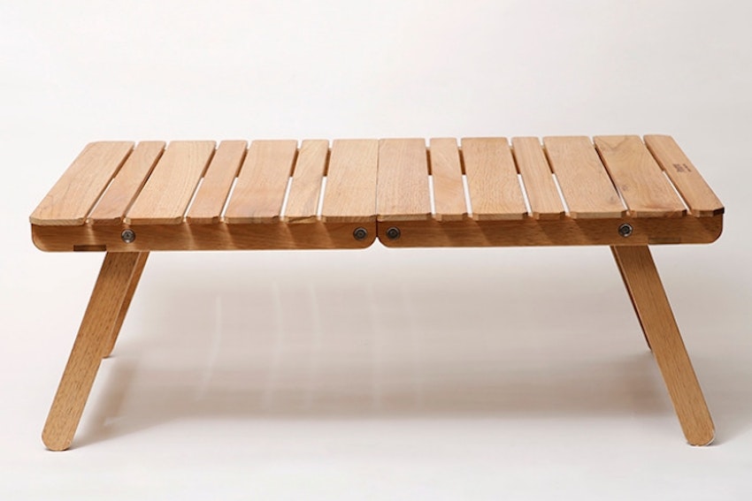 天板を開くと自動的に脚が飛び出てくるのが特徴。難しい組立作業は必要ありません。竹集成材でできた天板は見た目にも美しく、四隅が丸く加工されているのも細かな配慮があり◎。ロースタイル用のサイズ違いも展開しています。