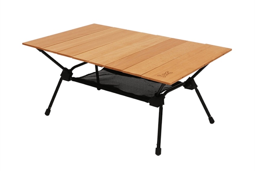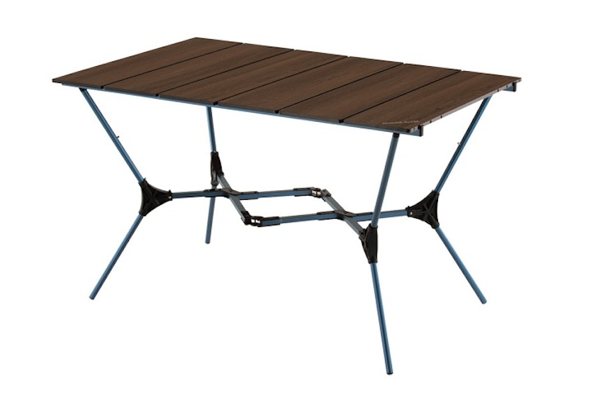 落ち着いた色味が人気のキャンプ用テーブル。高さが3段階調節可能なので、ロースタイルのキャンプにも使える汎用性の高さが特徴。天板の大きさが一回り小さい「バタフライテーブル90」も展開しています。