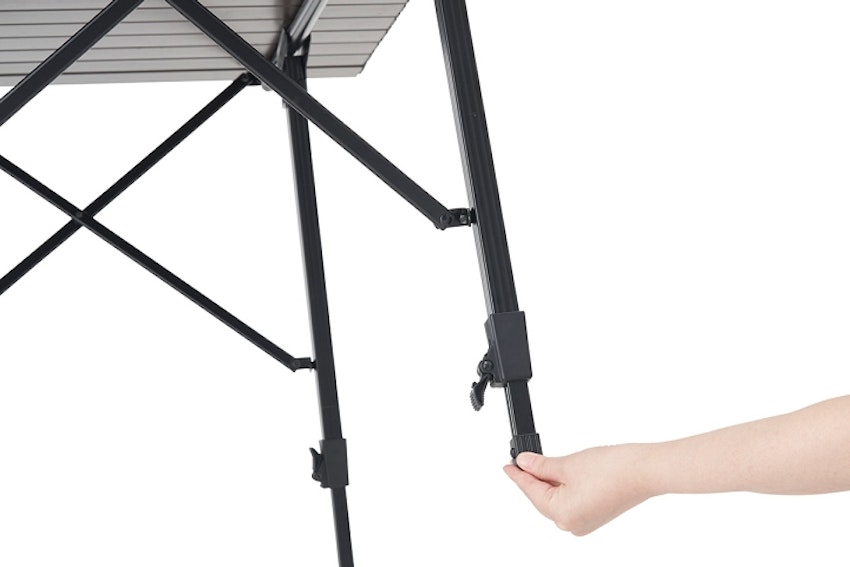 天板はステンレス製で熱に強く、エンボス加工がされているのでキズも目立ちにくく、鍋やバーナーを直接置いても安心。丸ごと水洗いができるので常に清潔に保つことができるのも嬉しいポイント。スタンドが天板にぴったり収まるので、収納時はコンパクトになります。