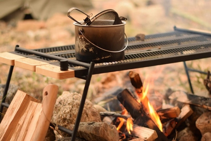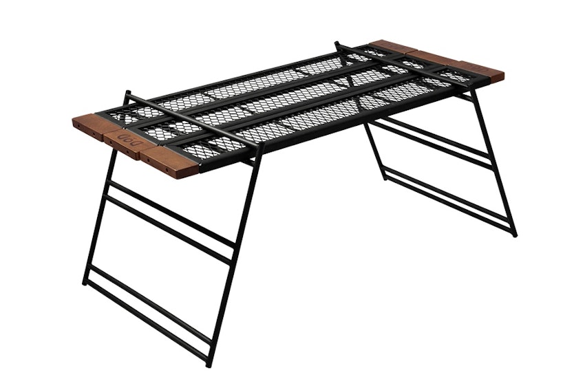 焚火ラックテーブルという名の通り、薪がテーブルの下に入れられるラックのような仕様になっているのが特徴。ステンレス製なので熱に強く、熱いものを置くことも可能。収納の際は板状に折りたたみ専用の収納袋に入れることができるので、持ち運びも楽ちんです。
