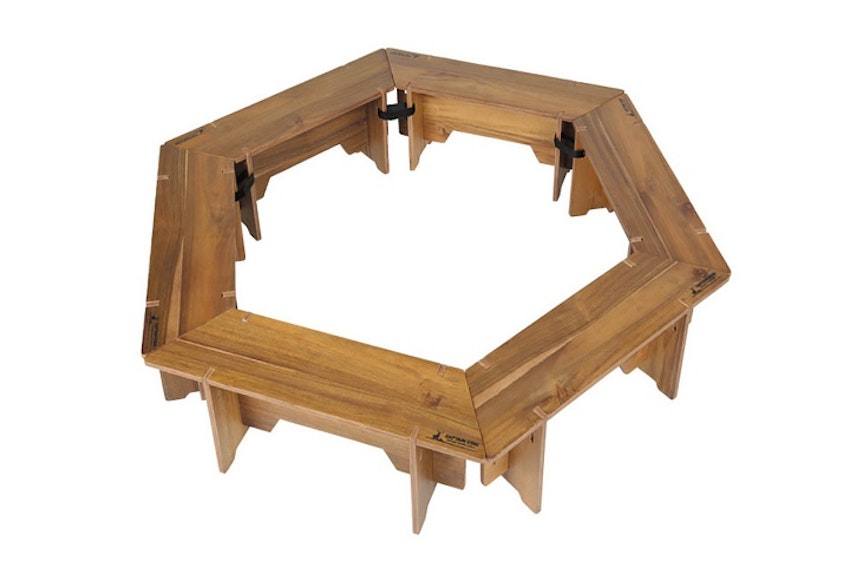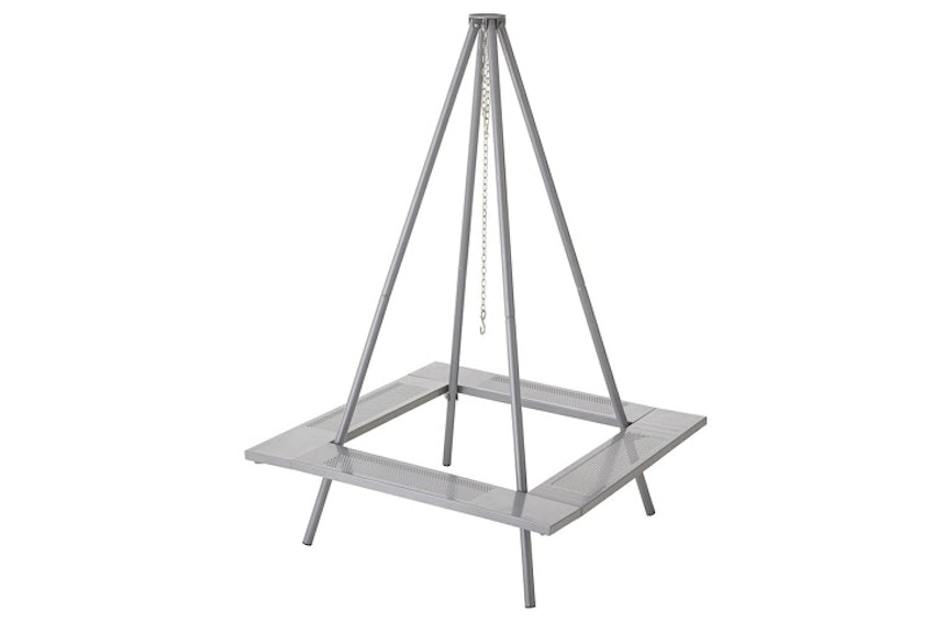 焚火の周りを囲んで囲炉裏スタイルが楽しめるこちらのテーブル。天板は軽量で丈夫。細かいパーツがなく、天板を載せるだけの簡単な設計なのも嬉しいポイント。フックつきのチェーンがついているので、手持ちの鍋をひっかけて楽しめます。
