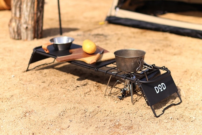 テーブルの幅を無段階で調節でき、天板と五徳を自由に付け替えできるコンパクトテーブル。ソロキャンプでキッチンを充実させたい人におすすめです。焚き火のごとくにしたり、天板のみにしたり、シーンに合わせて使えます。
