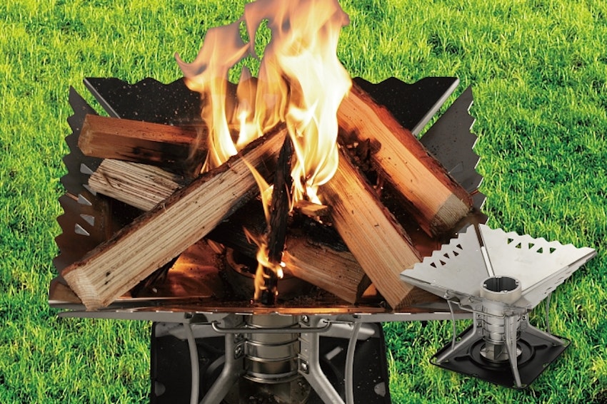 プレゼントひとつ目は、SOTOの焚き火台です。中央の筒の下から空気を取り込む設計になっており、薪への着火を促してくれる優れもの。筒状のアイテムの「エアスタベース」と、周りに装着する「エアスタウイングM」のセットが抽選で1名様に当たります。