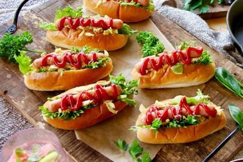 4. 粒マスタードをひき、ウインナーをのせて最後にケチャップをかければ完成。