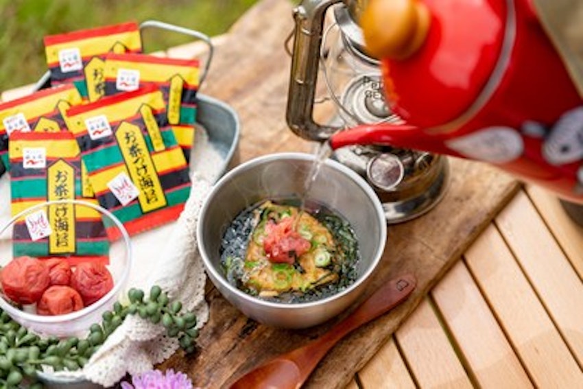 お湯を注ぐと冷凍焼きおにぎりから香ばしい醤油の出汁がでてお茶漬け海苔とすごく合います。梅干しを入れるのもポイントでした!