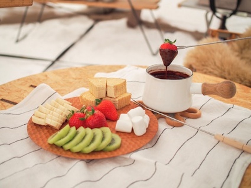 4. フルーツをピックに刺して、チョコレートをからめて食べる。
