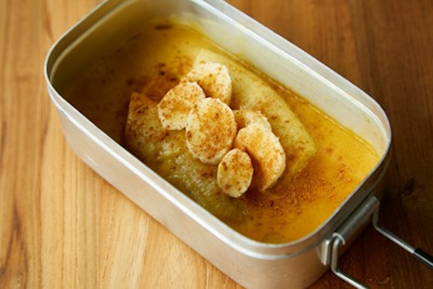 2. メスティンの内側にバターをたっぷりと塗り、残りのバナナとプリンを入れる。