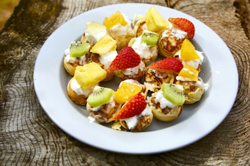 4. 焼けた3を皿に並べて、生クリームとお好みのフルーツを盛り付けてできあがり。