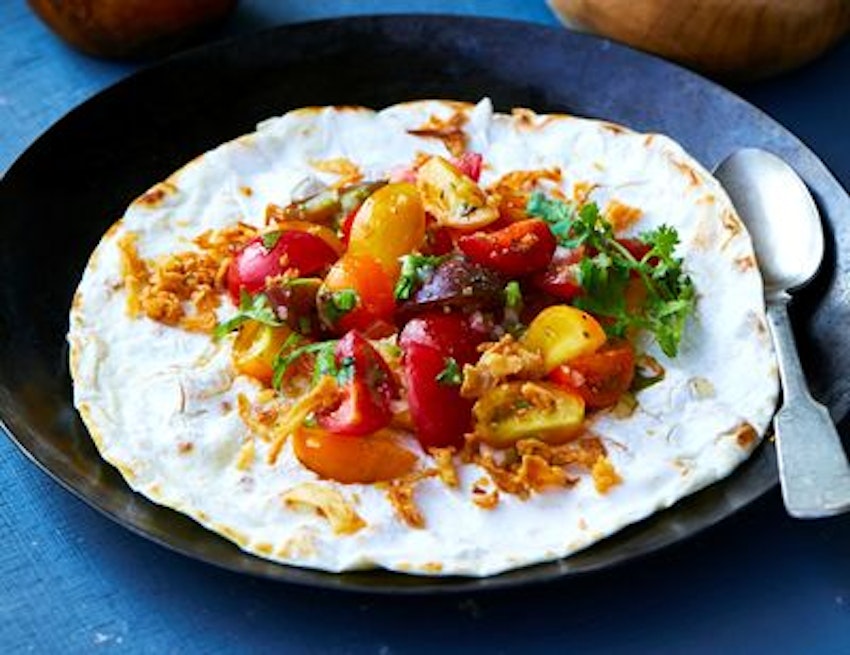 3. トルティーヤの表裏をサッとあぶり、片面にカッテージチーズをぬる。