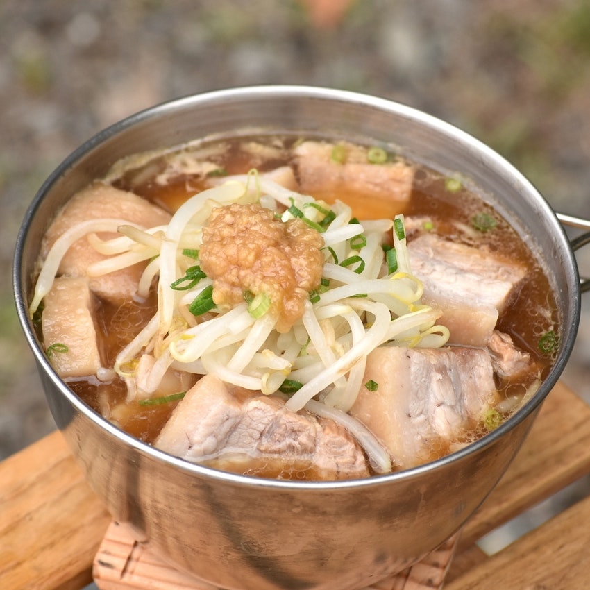 ⑤ 麺が茹で上がったら、豚バラ肉、もやしを山になるように盛り、小ねぎ、にんにく背脂(大さじ1)を乗せて完成。お好みでアウトドアスパイスをふる。