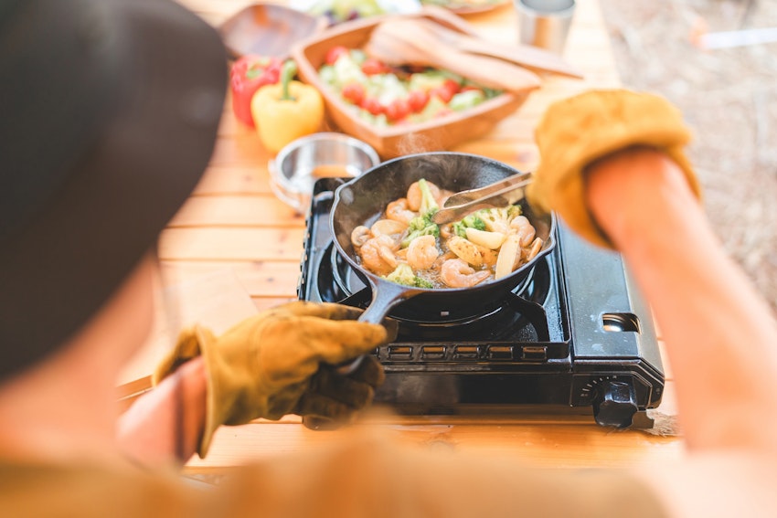 調理にはガスバーナーやカセットコンロなど、火起こしなしですぐに調理を始められるものを使う、
