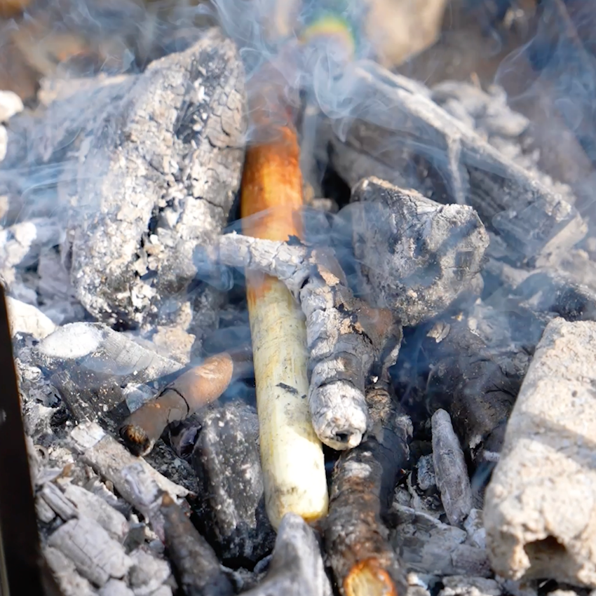 ③ 根本を切り落とし、焦げた皮を剥いて、お好みのアウトドアスパイスなどをふりかけてめしあがれ。