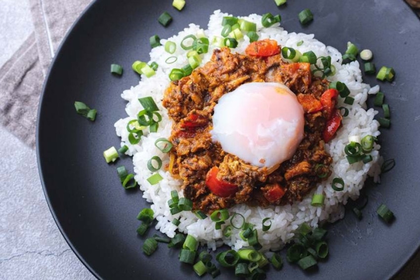 5.ごはんの上に4を盛りつけ、温泉卵、ねぎをトッピングして完成。