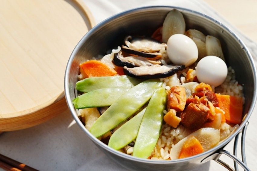 3.1に2と焼き鳥缶、絹さや、しいたけを乗せて沸騰するまで強火にかける。沸騰したらとろ火にしてお釜ヘッドで蓋をし、約15分炊く。炊けたら10分蒸らす。