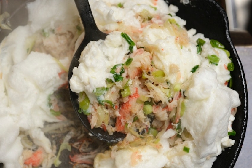 あとからメレンゲを加えるので、調味料を加えたときの味は少し濃いめでもOK。サーブは4の真っ白な状態でテーブルに出し、5の作業は食べる直前にゲストの目前でやると驚きもプラスされておすすめ。