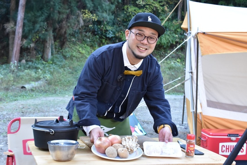 ヤマケンさんは煮物で対抗!料理名は「ぶっ込みポトフ」です。ダッチオーブンで手羽先を焼いたあとは、水と野菜を入れて煮込むだけという簡単レシピ。「余計な調味料は入れず、最後にスパイスをふって好きな辛味に調整してください」とヤマケンさん。