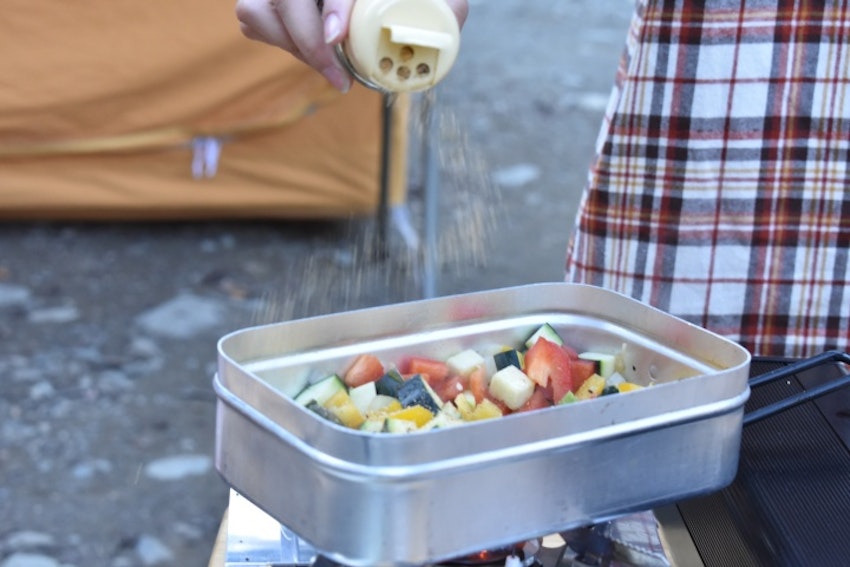 続いて、森風美さんはメスティンでパプリカ、ズッキーニを炒め、ここでも「チャムスオリジナルスパイス」で味をつけます。