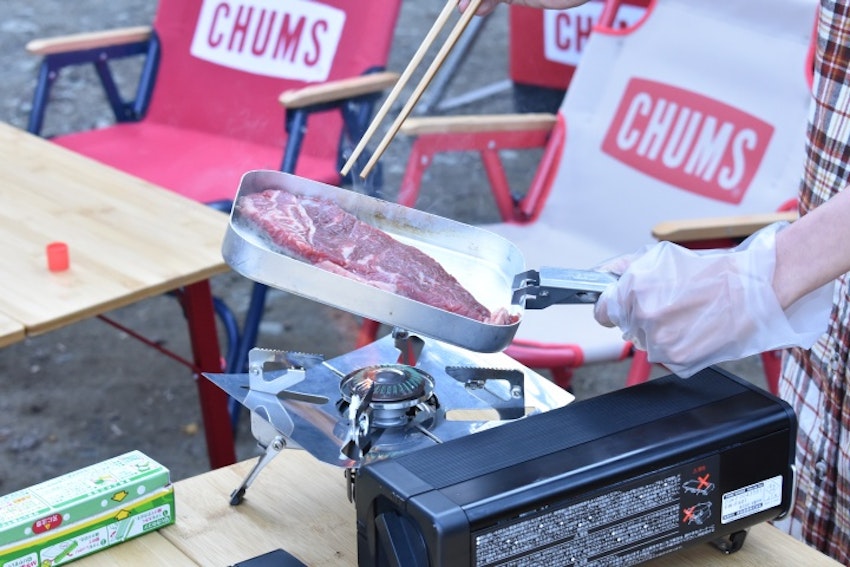 「チャムスオリジナルスパイス」でお肉に下味をつけたら、メスティンのフタをフライパンのようにして、牛肉を焼いていきます。