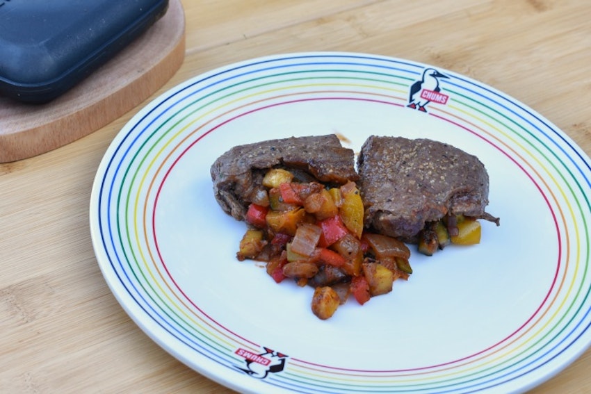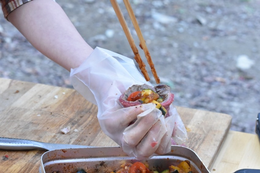 森風美さんの料理名は「牛肉のホットサンドラタトゥイユ風」。チャムスオリジナルスパイスで下味をつけた牛肉を袋状にして、野菜を詰めた一品。即興で作ったとは思えない完成度です。「スパイスにセロリが調合されているので、牛肉の臭みを軽減してくれていると思いますよ」と森風美さん。
