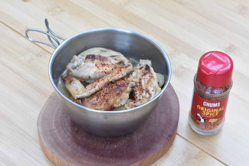 手羽先の優しい出汁に「チャムスオリジナルスパイス 」がアクセントに。最後にふりかけることで、スパイスの風味を活かした仕上がりになっています。料理の途中でも、出来上がったあとでも使えるスパイスですね。
