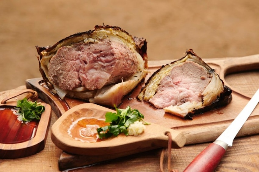 4.ダッチオーブンに3を敷き詰め、2の豚肉を入れて1時間程炭火の中に置いて完成。