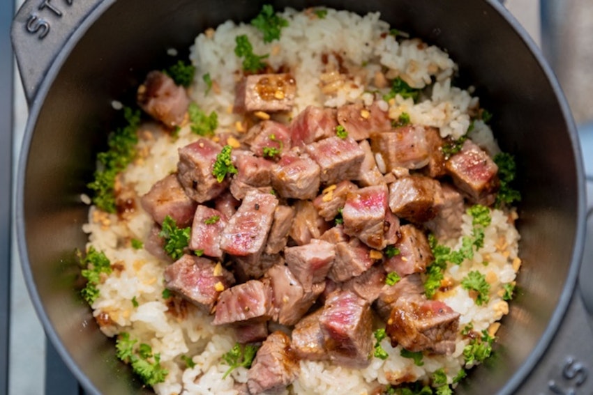 4.炊きあがったご飯にステーキ、フライドガーリック、パセリをのせ3のステーキソースを回しかけたら完成。