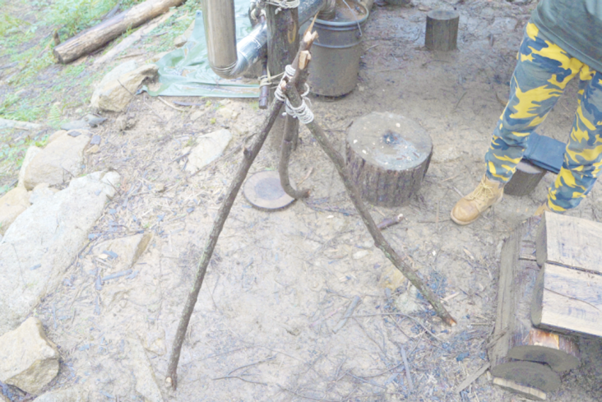 第3位はトライポッドです。さすが、さばいどる、手作りしちゃいます。サイトの近くにある木を3本調達し、ロープで括り5分ほどであっという間にトライポッドを作ってくれました。