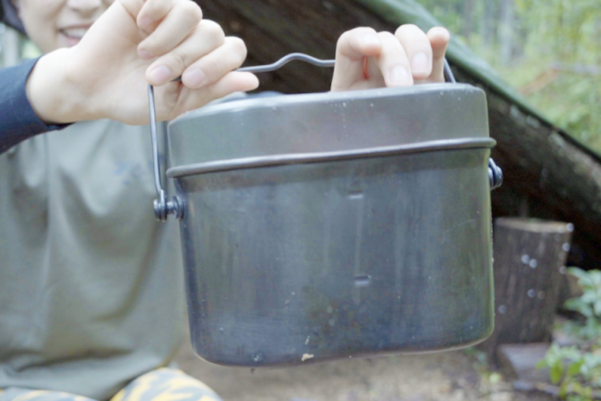 「炊飯はもちろん、煮る、焼く、蒸すなど飯盒ひとつでなんでも作れちゃうので重宝しています」。1,000円台で手に入るコスパの良さも飯盒の魅力。持ち物が少ないサバイバルスタイルの彼女らしい調理器具のチョイスですね。