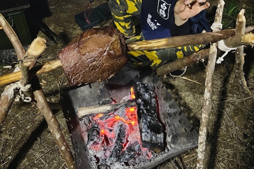 ふたつのトライポッドの間に木を渡すことで、漫画のように塊肉をワイルドに焼けます。ソトレシピTVの「【兵式飯盒】さばいどる・かほなんさんのプライベートサイト&ギアが凄いことになっていた...!【女子ソロキャンプ】」でトライポッドの詳しい作り方を解説しているので、ぜひ挑戦してみてください。