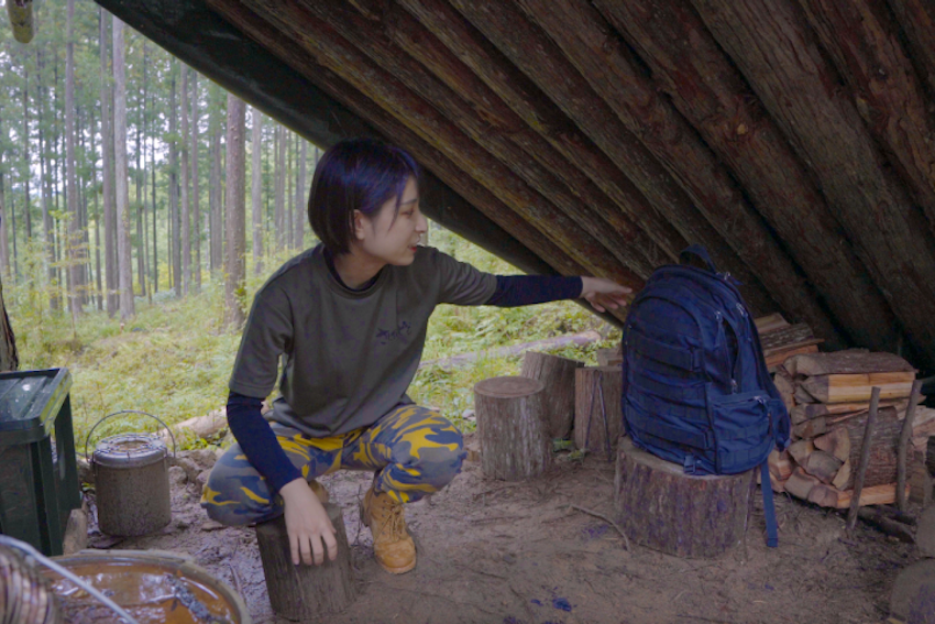 「チェーンソーで切り倒した木でシェルターを作るなど、いろいろと遊んでいます。私のYouTubeチャンネルでもたびたび登場する場所です」。シェルターのなかは、中央に置かれた丸太の椅子からほとんどのものに手が届くようにレイアウトしています。