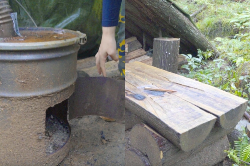 ペール缶の薪ストーブや自作のテーブルなど、サバイバルの知見が随所に見られる空間です。薪も木を切り倒して現地調達しているそうで、本格的なキャンプを楽しんでいることが伺えます。