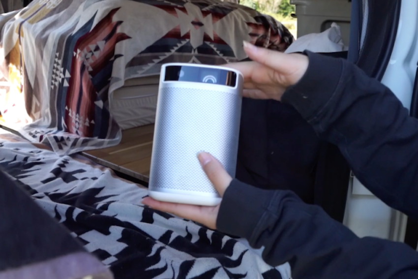 これは何かというと…手のひらサイズで場所をとらないコンパクトボディのモバイルプロジェクター。外出先や旅先でも、感動の映像体験を楽しめます。「スクリーンはハイエースのカーテンレールにかけると、ジャストサイズ!」