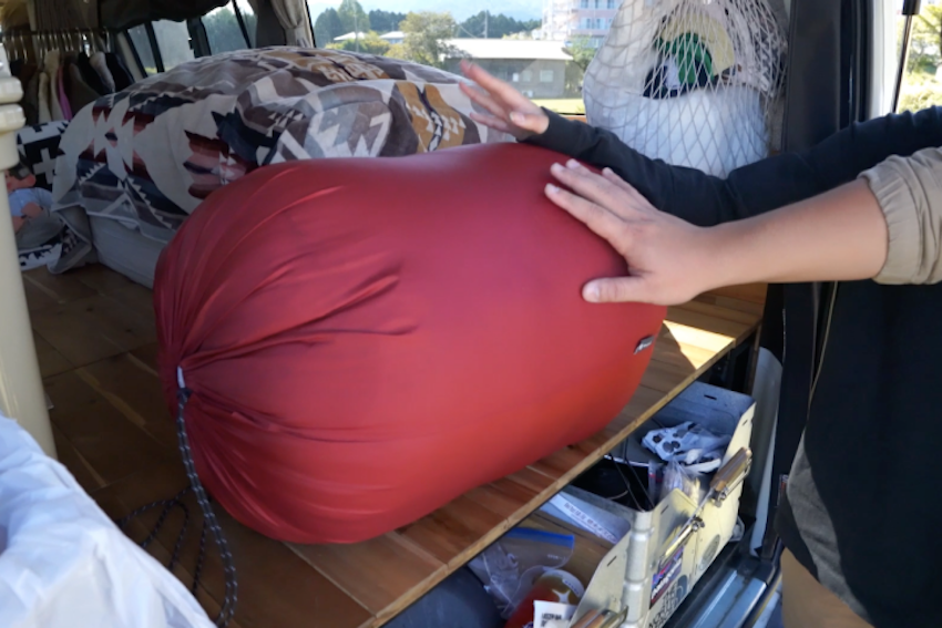 「2人用のワイドなシェルフです。めちゃくちゃ温かい掛布団で、このおかげでー10度の山梨もギリギリ乗り越えられました」
