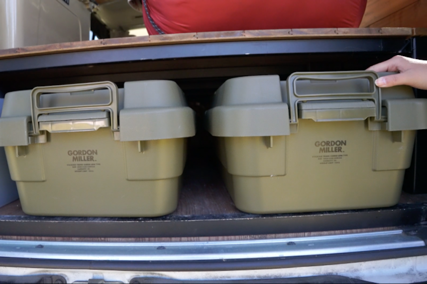 「車を購入する前から持っていたコンテナですが、下のスペースにぴったり収まりました!右側はガジェットや撮影機材、ガス管、三脚、ランタン、左側はキッチンツールと、ざっくり分類して使っています」