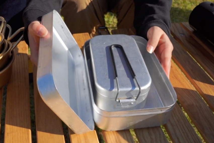 スウェーデンの老舗ブランド「トランギア」のメスティン。収納力アップの技としてラージサイズの中にもうひとつ小さいメスティンを収納しています。