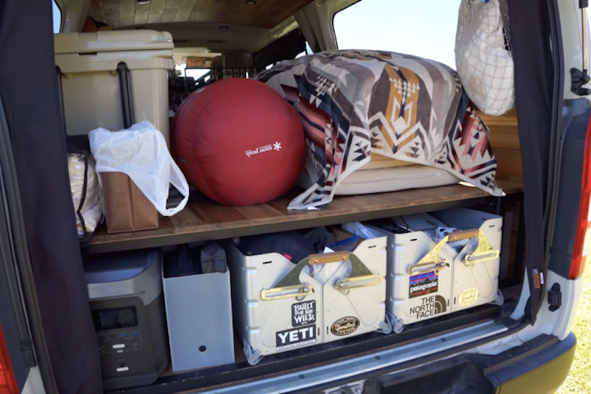 最下層のスペースには旅に必要なアイテムが詰まったコンテナのほか、タープや椅子、机、焚火台、など、ものすごく多くのものが入ります。