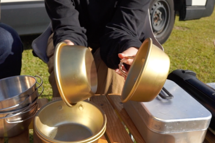 本来は韓国のお酒・マッコリを飲むカップをアウトドア用に使用しています。リーズナブルかつ、まみさんの好きなゴールドで、大のお気に入りなんだとか。ご飯やお味噌汁を入れるなどシェラカップのように使っています。