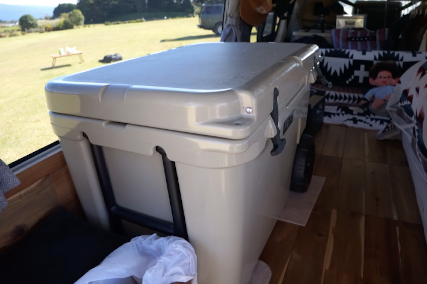 ビッグサイズのクーラーボックスは、まみさんから学さんへの誕生日プレゼント!まみさんは本当は小さめの45Lが欲しかったのに「タイヤがかっこいいから」と絶対に譲らない学さんの想いを叶え、このサイズに。