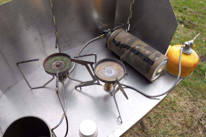 何でも作れる分離型タイプが好きというリロ氏。「下がステンレス系のテーブルなので、輻射熱を気にせずガンガン使えます。あまりに寒い日はCB缶がドロップダウンで火力が落ちるのと、山歩きだとコンパクトのほうがいいのでOD缶を持っていきますけどね」
