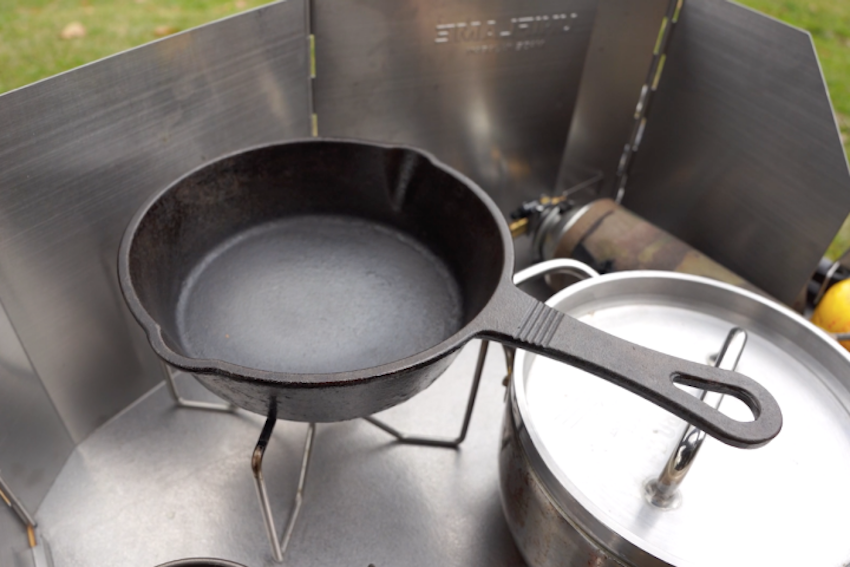 「普通汚れたら洗わなきゃですが、スキレットなら空焚きして炭化させて拭き取ってしまえば簡単に再使用できます。水が少ない、洗えないようなところでも、スキレットさえあれば1日2日なら何回でも使いまわせますよ」