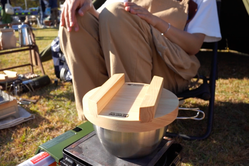シェラどんぶりにぴったりハマる専用のフタ「お釜ヘッド」で、ちょもかさんが気に入っているのは、その香り。国産ヒノキをぜいたくに使っているため、料理中もヒノキ特有の心落ち着く香りに癒されるのだとか。