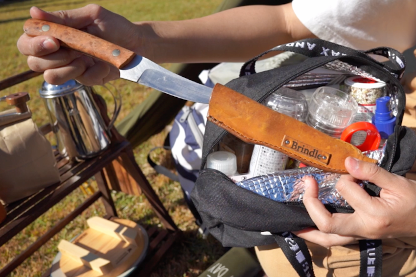 調味料を入れたバッグには、歴40年の職人が手掛けた切れ味抜群のナイフが入っています。どちらも料理に欠かせないものですから、一緒にしておくことでカバンの中で迷子になることがなさそうです。